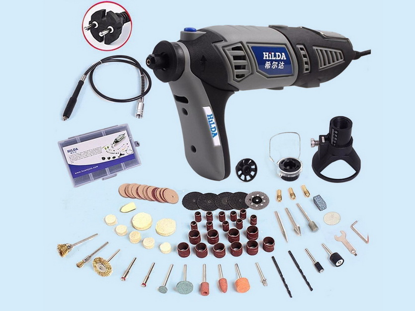 Компактная бормашинка ака гравер с дополнительной съемной ручкой, обеспечивающей удобный хват двумя руками. И, конечно, качественным мотором от Hilda.