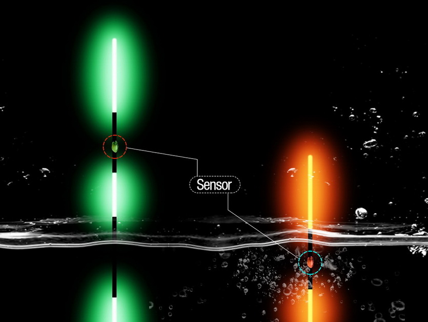 Поплавок со светодиодным датчиком. Пока устройство находится над водой, горит зеленый. Как только начинает клевать, и поплавок оказывается под водой, свет меняется на красный.