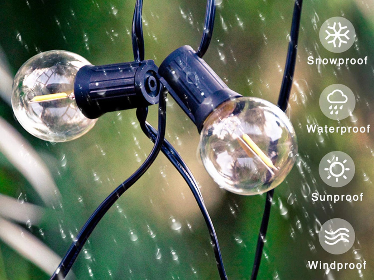 Она защищена от влаги. Есть разные варианты по длине вплоть до 26 м. На каждом разное количество лампочек до 52 штук. Можно соединять вместе сразу несколько гирлянд.