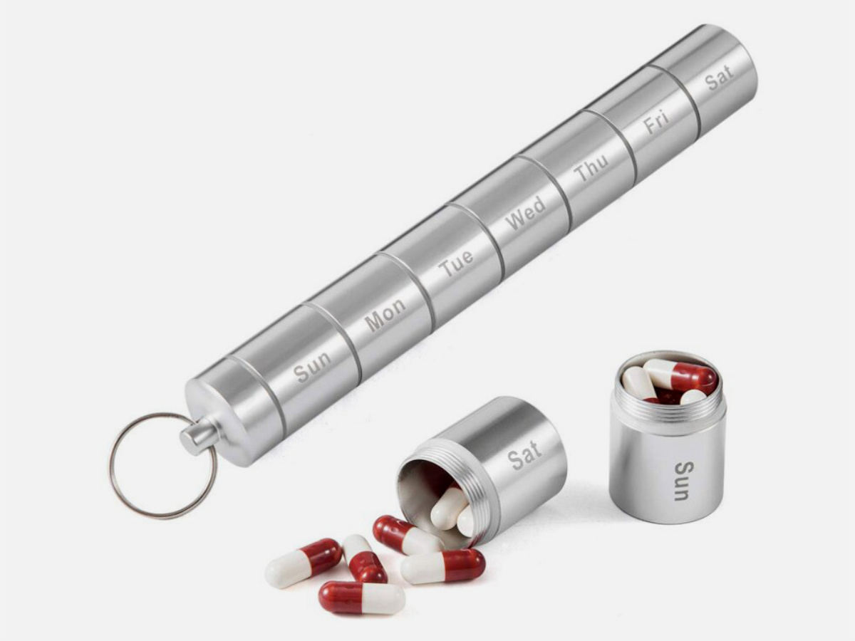 Удобный кейс из алюминия в формате вкручивающихся друг в друга цилиндров. Он даёт возможность хранить внутри витамины на каждый день на целую неделю.
