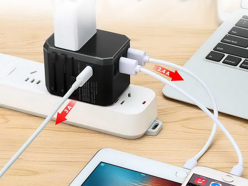 Суперкомбо для поездок: переходник для всех типов розеток (Европа/США/Австралия/Китай) совмещен с продвинутым блоком питания.