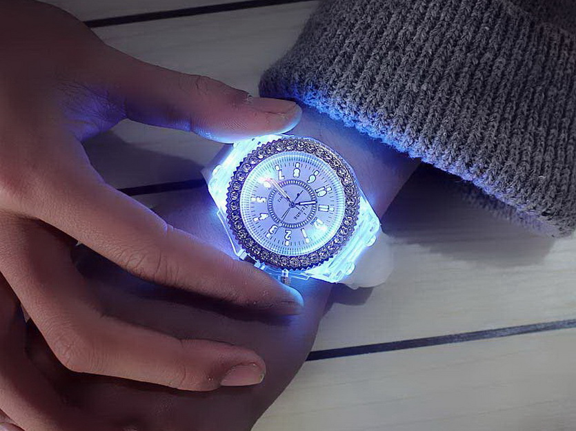 Подсветка переключаемая, 7 цветов. Есть несколько вариантов циферблатов и оформления, в том числе пара мужских и молодежных.