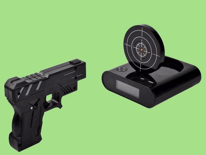 Этот будильник оснащен мишенью с инфракрасным датчиком. В комплекте – пистолет с соответствующим светодиодом. Чтобы отключить будильник, потребуется попасть в мишень. И никак иначе, так что придется проснуться.