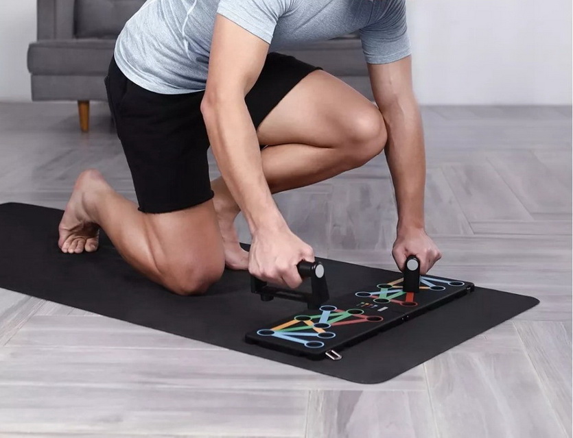Маленькая складная доска с отверстиями для пары ручек. Такую удобно носить с собой, раскладывая в компактный фитнес-тренажёр.