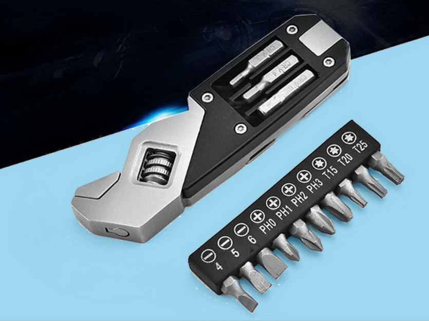 Неплохой мультитул, основным инструментом которого стал разводной гаечный ключ. Так же в состав входит держатель и 13 бит.