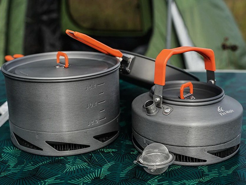 Набор походной посуды из сковороды, сотейника-кастрюли и чайника. Все приборы предназначены для использования на плите, газовой горелке и костре.