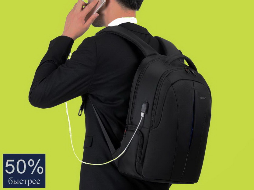 Есть кодовый замок, внешний USB для зарядки гаджетов, чехол от дождя, двойная молния-антивор. Сам рюкзак тоже воды не боится.