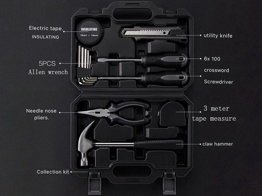 Базовый набор инструментов для дома в 2 вариантах: на 12 или 60 штук, каждый из которых поставляется в собственной версии пластикового ударостойкого кейса.