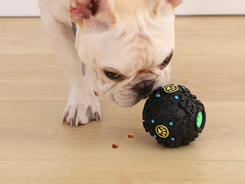 В жесткий резиновый шарик из безопасных гипоаллергенных материалов насыпается любимый корм.