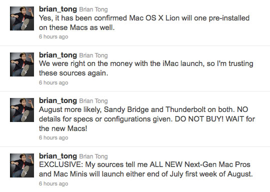 Похоже, Apple действительно хочет обновить оставшиеся компьютеры Mac до конца лета, чтобы осень (и, видимо, новогодние праздники) полностью посвятить iOS. Обозреватель CNET Брайан Тонг написал в своём Твиттере следующее: