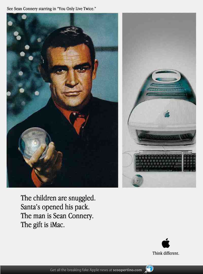 Когда в 1998 году Apple вывела на рынок iMac, Стив Джобс очень хотел видеть Шона Коннери в рождественской рекламе революционного по тем временам компьютера. Джобс лично написал актеру письмо с приглашением сняться в ролике и даже приложил макет постера, где Агент 007 держит в руках загрузочный диск с операционной системой Mac OS 8.1, которая ставилась на первые аймаки. Любопытно, что сам iMac впоследствии имел кодовое название «Bondi Blue». Первое слово Bondi намекало на Бонда, а второе Blue – на фирменный цвет его монитора, мыши и логотипа.