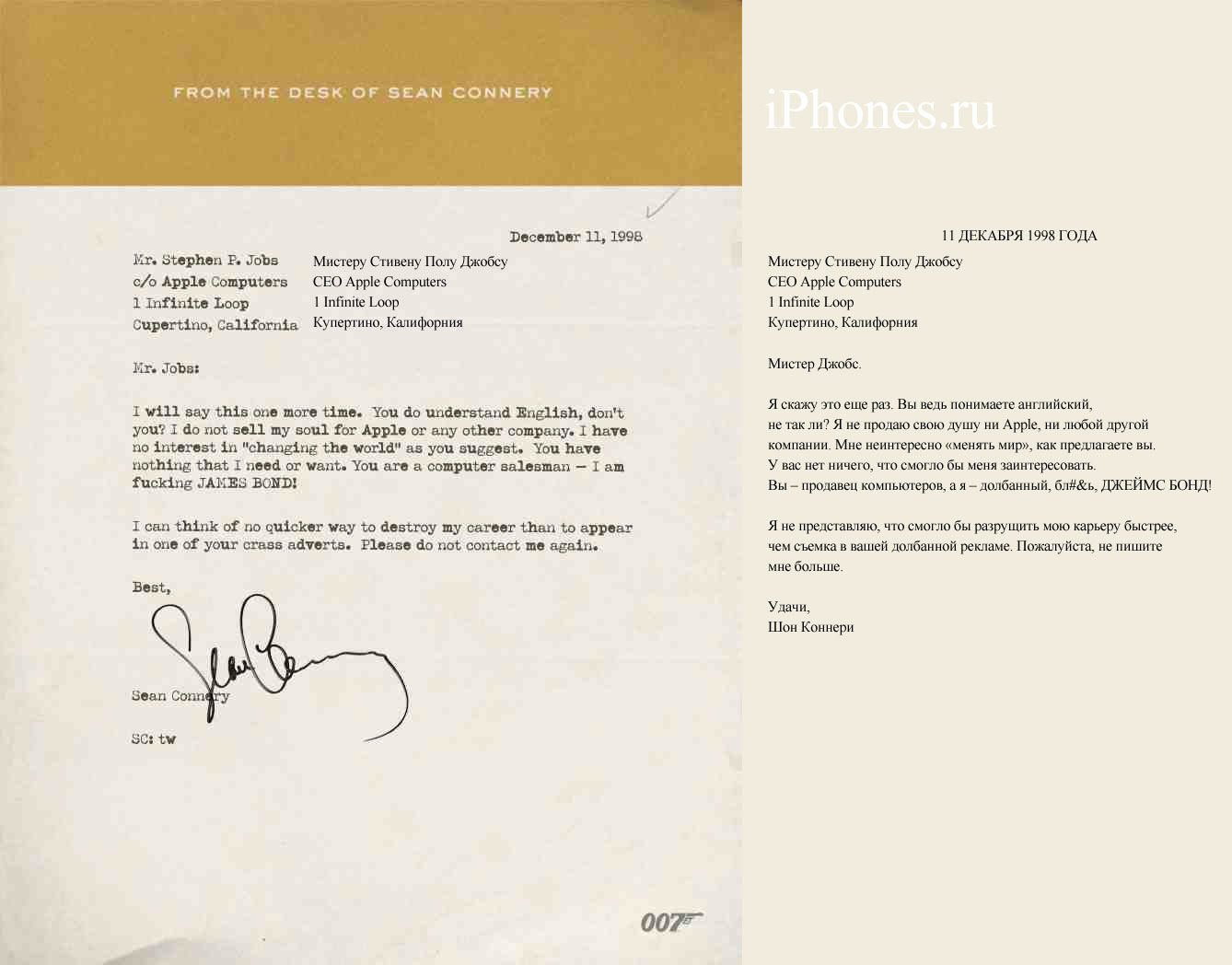 Не получив ответа от своего кумира, Стив расстроился. Время поджимало, на носу были праздники, а съемка ролика требовала несколько дней. Стив отправил второе письмо, но Коннери отказался. В свойственной ему манере Стив Джобс решил взять актера на измор, отправив третье письмо, где обрисовал приличный гонорар, потом четвертое. Незадолго до начала праздников в ящик Джобса упал долгожданный конверт с фирменным бланком Агента 007.
