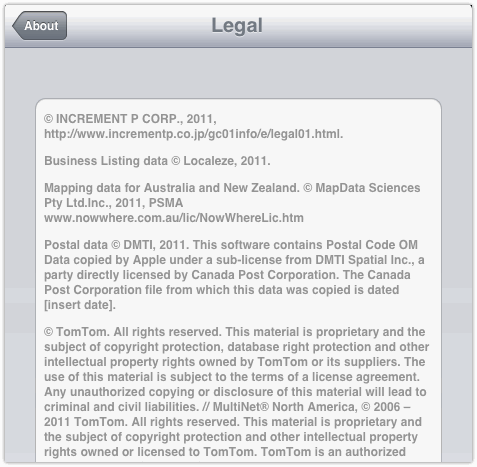 Apple продолжает разрабатывать свои собственные картографические сервисы. Сам факт их существования в той или иной форме не раз подтверждался косвенно — например, открытием соответствующих вакансий. Результаты работы разработчиков Apple над правильными «Картами» держатся в строжайшем секрете, но далеко не все секреты можно скрывать от буквы закона. Поэтому в бета-версии iOS 5 впервые появились упоминания ряда компаний, картографические и геолокационные продукты которых в теории задействованы в прошивке. Информацию нашли в разделе авторских прав.