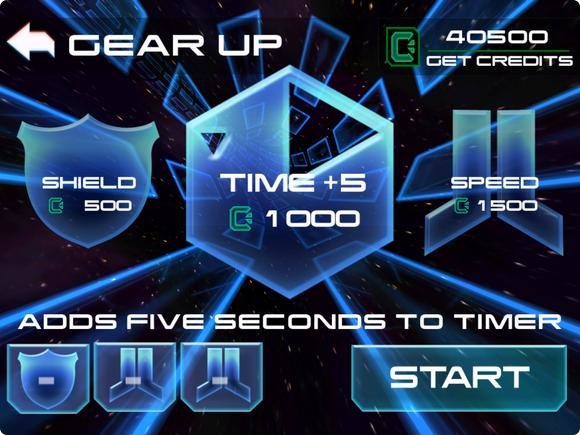 Что нового в эту концепцию привносит Supersonic HD? Практически ничего. В игре два режима — Blitz и Classic. Если второй представляет из себя полную копию игрового процесса, описанного выше, то первый чуточку более интересен. Вместо «жизней» нас ограничивают во времени: около 40 секунд на то, чтобы продвинуться как можно дальше по случайно сгенерированному треку. В нашем распоряжении — три вида powerup-ов: щит, дополнительные пять секунд и ускорение. Приобретаются они на внутриигровую валюту, которую можно восполнить из собственного кошелька.