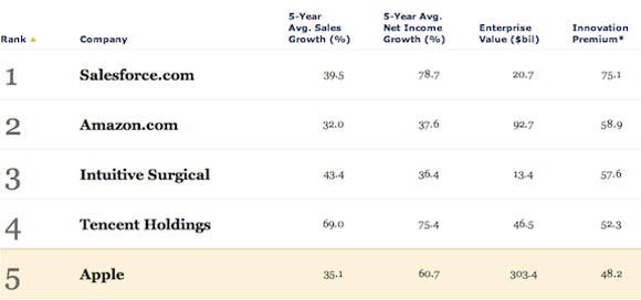 На первых четырех позициях разместились компании Salesforce.com, трудящаяся на на ниве облачных технологий, магазин-гигант Amazon.com, создатели хирургических роботов из Intuitive Surgical и одна из самых крупных интернет-компаний в Китае Tencent Holdings. На пятом месте торжественно восседает компания Apple, которая в кругу лидеров разных отраслей мировой индустрии нескромно выделяется своей рыночной стоимостью. Подсчет общего балла проводился с помощью суммы денежного оборота компании и так называемой чистой приведенной стоимости.