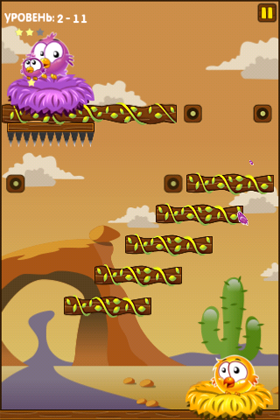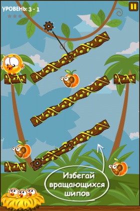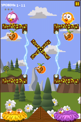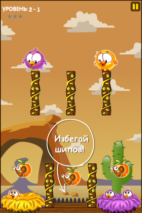 Принцип «звездности» уровней такой же как у Cut the Rope или Angry Birds, только в этом случае конфеты и сбитые свиньи заменены на червячков, спрятавшихся в надгрызенном яблочке, которых не просто нужно собрать, но и донести до желторотиков в гнездо. У каждой птички ( а их бывает две — желтая и фиолетовая) свое гнездо и разное количество детенышей. На это надо обращать внимание, управляя одной или другой животиной. Если вы даже соберете все яблочки, но разнесете их не по своим гнездам – трех звезд в уровне вам не видать.