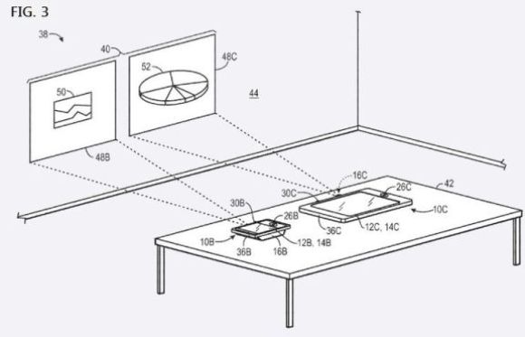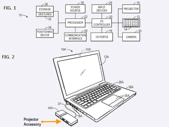 Документ, опубликованный Федеральным агенством по патентам и торговым маркам, свидетельствует о планах интеграции мини- или пико-проектора в будущие iOS устройства, и введение их как аксессуаров для MacBook.