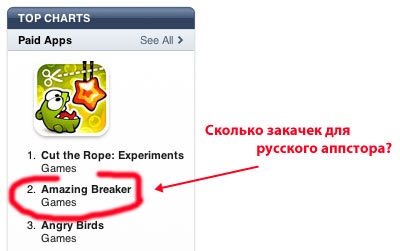 Перед написанием материала я поделился с авторами своим положительным впечатлением от геймплея. Те сразу купили Amazing Breaker, прошли несколько уровней, чтобы затем вернуться с огнем в глазах. Значит, не мне одному понравилось творение красноярских разработчиков из компании Dekovir. Надо отметить, что волна обзоров западных ресурсов уже прошла, поэтому корреляция русской статистики была бы на нашей стороне. Через 10 часов после обзора Amazing Breaker вошла в ТОП-10 и стала резко подниматься наверх, пока не закрепилась на втором месте игрового рейтинга между Cut the Rope и Angry Birds. И на пятом месте в рейтинге всех программ Russian App Store. На данный момент ситуация не изменилась и я попросил Дениса Шишкина (Dekovir) дать статистику по продажам, а именно – сколько покупок надо, чтобы выйти на второе место.