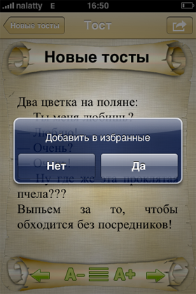 Если вы готовитесь к торжеству заранее и вычитываете подходящие слова уже сейчас, можно легко добавить понравившийся тост в категорию избранное, отправить по электроной почте, запостить в twitter или facebook. А можно даже записать новенький чужой тост в свою копилку, нажав “плюс” вверху экрана.
