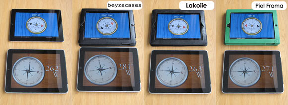 Так, без чехлов два аппарата показывают почти одно и то же направление: 260 градусов на исследуемом аппарате, и 262 градуса на эталонном. С чехлом beyzacases iPad поначалу упорно выдавал сообщение о помехах компаса. После длительных манипуляций все-же удалось получить результат – 298 градусов. Как итог, разница в 36 градусов от номинала. Чехол Lakoiie совсем не отклонил стрелку компаса – результат 263 градуса, что совпало с показаниями на на эталонном аппарате. Больше всего удивил чехол Piel Frama – iPad сначала указал на наличие помех, а потом выдал результат в 85 градусов. А это почти противоположное направление! Да, в походе гаджет с таким чехлом вполне способен повторить подвиг Ивана Сусанина…