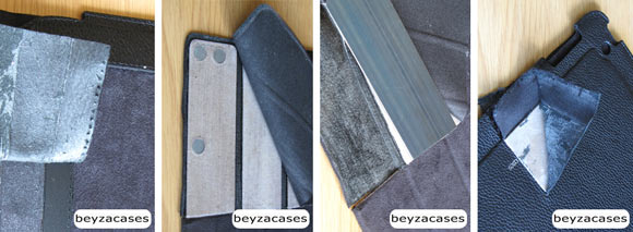 Первый пациент, а именно чехольчик Beyza, поддался только хорошим ножницам по металлу. Как оказалось, в крышке, прямо под кожей, спрятана мощная упругая металлическая пластина. Как я понимаю, ее металл призван экранировать воздействие магнитов на датчик включения аппарата, чтобы крышка не выключала iPad при перегибе назад. Возможно, пластина несколько гасит магнитные поля и для более-менее правдивого показания компаса. Кстати, магнитов, и довольно крупных, целых пять. Тот, который ближе к центру, отвечает за “засыпание” гаджета. Четыре магнита по углам фиксируют тяжелую крышку в закрытом положении. Остается только гадать, что произойдет, если металл со временем сам намагнитится. Остальные сегменты крышки – полоски жесткого картона. Бархатистый материал подкладки – искусственный, на тканной основе. Рамка экрана чехла выполнена из тонкого листового пластика, обтянутого кожей. Задняя часть чехла – кожа, картон и подкладка. Кожа и ткань подкладки в местах соединения “по кромке” как-бы спаяны в одно целое. Помимо спайки, чехол прошит по контуру. Швы легко поддались острому ножу, но очень маловероятно, что способны “разойтись” в процессе эксплуатации.