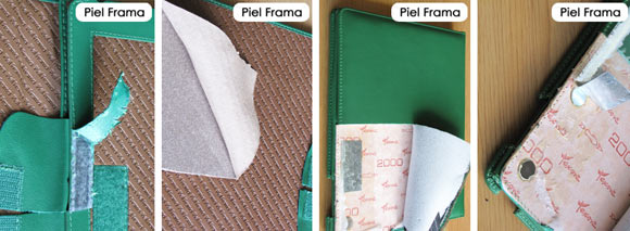 У Beyzacases подкладка из мягкого бархатистого материала, напоминающего замшу. Бытует мнение, что такая поверхность способна даже немного “чистить” поверхность экрана. Возможно, что это действительно так. И кожа, и подкладка темные – чехол выглядит строго и солидно. Вложить iPad в чехол от Beyza получилось легко и просто. Чехол ни тесный, ни излишне свободный. В самый раз. Фиксируется гаджет «язычком», который заправляется внутрь, «за iPad». Самым тугим оказался чехол Lakoiie. Нет, я не испытал проблем при вкладывании аппарата, но было действительно туговато. Справедливости ради стоит сказать, что раз на пятый (а iPad пришлось «переодевать» очень часто) «таблетка» вставлялась уже заметно легче – кожа аксессуара немного растянулась. Чехол как-будто обтекает iPad – аппарат держится очень надежно. А в чехол от Piel Frama «таблетка» вкладывается довольно свободно. Чтобы iPad не выпал при использовании, он фиксируется «язычком» на «липучке».