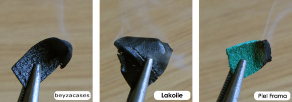 Заключительный этап сравнения ответил на вопросы относительно правдивости кожи. Горит ли кожа? Если долго подержать над огнем, то подсыхает и вполне неплохо горит. Этому способствует и нанесенная на поверхность краска. При не столь продолжительном воздействии огня кожа обугливается, выделяя характерный запах. Все образцы доказали, что заслуживают называться натуральной кожей.
