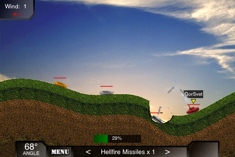 Скупились? В бой!!! Радует разнообразие пейзажей, которые принимают участие в геймплее. Тоесть уничтожаются выстрелами и взрывами. Процесс, на первый взгляд прост, но нет. Вам необходимо выбрать угол выстрела и его силу. И одна и вторая величина играют большую роль в вероятности попадания. Не забываем делать поправку на ветер. Вот так выглядит бой: