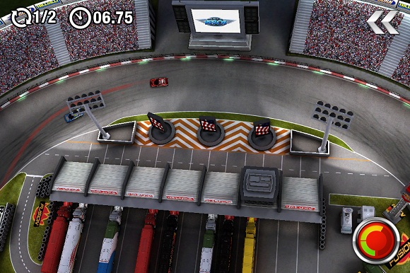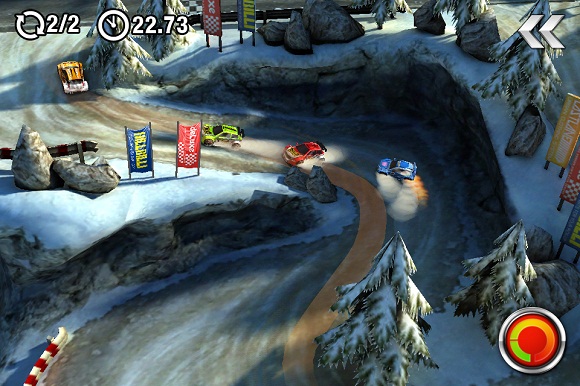 Как только нарисуете необходимое количество кругов, начнется гонка и вам будет отведена роль зрителя. Зрителя, да не совсем: во время гонки можно влиять на дополнительное кратковременное ускорение с помощью кнопки в углу экрана. Получается что-то вроде популярной “закиси азота”, активировав которую в нужный момент можно сгладить шероховатости не очень удачно нарисованного маршрута.