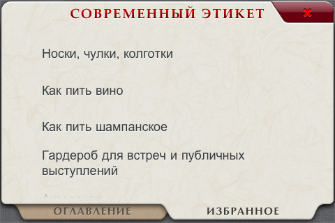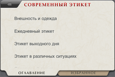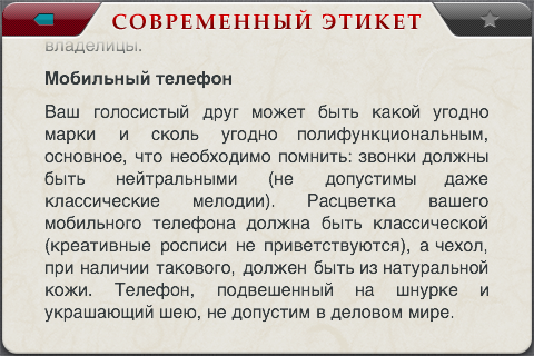 По сути, это приложение является интерактивным учебным пособием по современному этикету, четко поделенным по видам, временам суток и жизненным ситуациям.