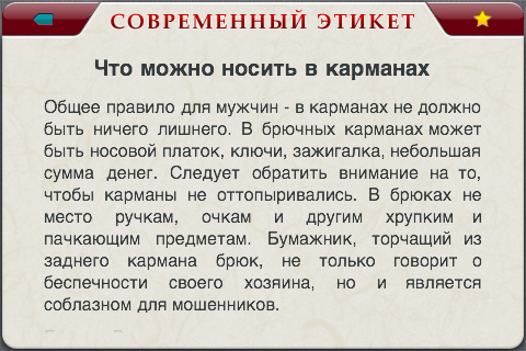 Например, если выбрать пункт “Внешность и одежда” и перейти на вкладку “Имидж”, мы попадем в свод общих правил, говорящих нам о том, как правильно нужно сидеть, ходить, одеваться и даже, что носить в карманах.