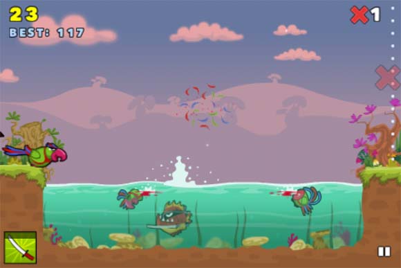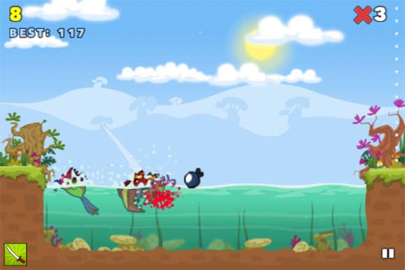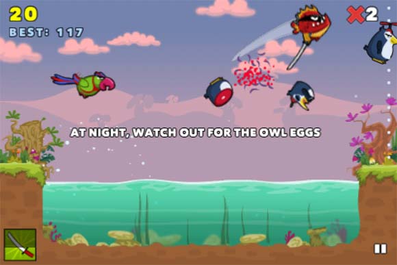 Обычно казуальные игрушки предлагают игроку какие-нибудь разнообразящие процесс “фишки” вроде внутреннего магазина, системы апгрейдов или новых противников. А в игре про пиранью нам предлагают лишь меч и птичьи яйца. Меч является чем-то вроде супер-оружия, рассекая пополам сразу нескольких птичек и избавляя нас от забот с поеданием. Разумеется, пользоваться холодным оружием на постоянной основе никто не даст и через несколько мгновений резни наступает длительное затишье на время заполнения иконки оружия в левом нижнем углу. А с яйцами все еще проще: ночью появляются совы, метко сбрасывающие в пруд золотистые яйца. Понятно, что таких подарков лучше бы избегать.