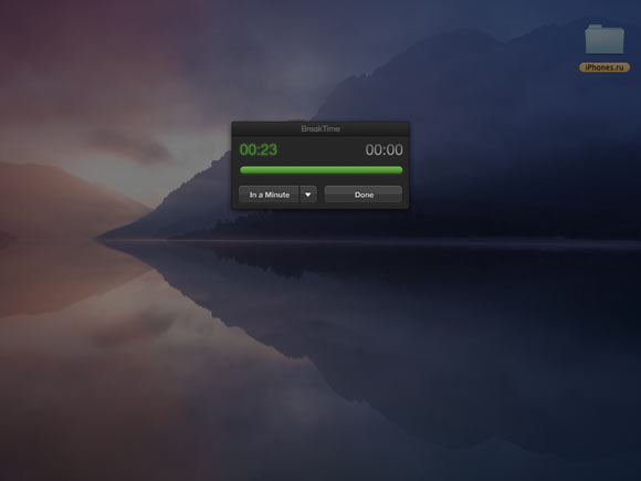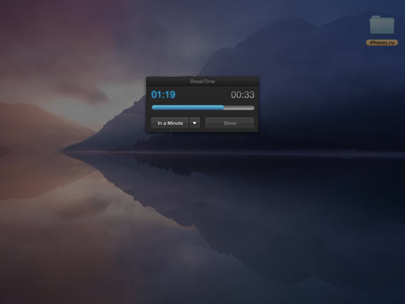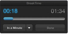 Когда наступает время отдохнуть, экран притеняется, а компьютер перестает отвечать на любые команды с клавиатуры. Время перерыва можно сдвинуть с помощью меню In a Minute или отменить кнопкой Done (которую тоже можно заблокировать для честности).