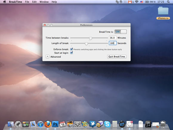Программа BreakTime будет делать это за вас. Причем не просто оповещать, что пришло время перерыва, но еще блокируя компьютер – хватит, мол, засиделся, сходи разомнись на пару минут.