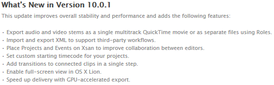 Сегодня ночью Apple выпустила масштабное обновление для пакета Final Cut Pro X, включающее в себя приличное количество изменений, покрывающих часть претензий «профессионалов» относительно потерянной функциональности в новой редакции программы. Появилась поддержка импорта и экспорта проектов в формате XML, что наконец-то позволяет без труда редактировать материалы, смонтированные в прошлой версии FCP. Apple спешит добавить, что поддержка multicam и высококачественного мониторинга видео будет добавлена «в начале 2012 года».