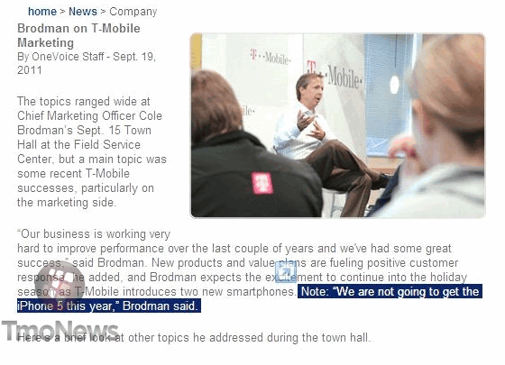 В ходе встречи со своими подчинёнными, глава отдела маркетинга Коул Бродман заявил: в этом году их компания не получит iPhone 5. Соответственно, он не будет субсидироваться и вообще продаваться через сети фирменных магазинов. Информация всплыла из-за публикации текстовой транскрипции встречи, изначально предназначенной для внутрекорпоративной аудитории.