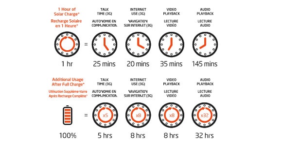 Для подзарядки iPhone в условиях отсутствия солнечного света встроенный аккумулятор имеет емкость 1800МА/ч. Согласно спецификациям, час нахождения устройства на солнце дает дополнительные 25 мин разговора или 145 мин прослушивания музыки. Разумеется, встроенный аккумулятор изначально удваивает время работы гаджета, а солнечные батареи увеличивают уже и без того продолжительную автономность. Но всю красоту этих данных портят габариты новинки. Носить почти вдвое утяжеленный iPhone с габаритами 61.9 x 129.5 x 22.2мм явно не вписывается в общепринятые представления о портативном смартфоне.