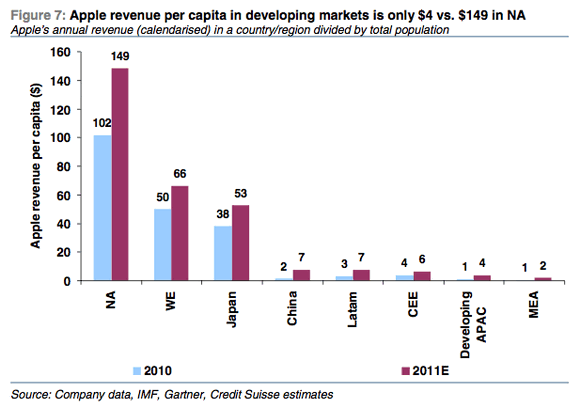 В развивающихся странах к 2015 году число людей, зарабатывающих 30 тысяч долларов в год и более, вырастет с 133 миллионов до 244 миллионов. Если Apple будет продолжать развивать свой бизнес в этих регионах, к концу 2015 года ей удастся заработать дополнительные 70 миллиардов долларов.