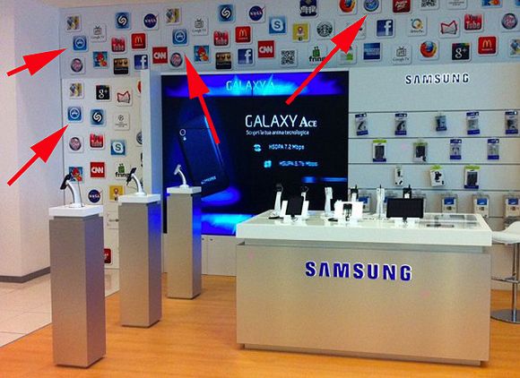Посетители недавно открытого итальянского магазина Samsung обратили внимание на яркую стену за стендом со смартфонами Galaxy Ace. Композиция из повторяющегося набора мобильных приложений отражает свободу и широту выбора… которой нет ни на одной существующей мобильной платформе. Не понаслышке знакомые с продукцией Apple, посетители запечатлели эту стену и отправили фотографию в редакцию западного портала All Things Digital. Что в ней такого интересного?