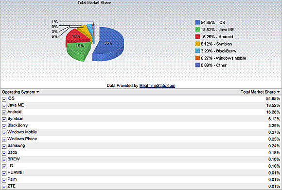 И последнее, при этом не менее важное наблюдение NetApplications заключается в том, что iOS продолжает лидировать на мобильном рынке в области веб-серфинга вместе с 54,65%. На втором месте — платформа Java ME (18,52%), то есть обычные мобильные телефоны и лишь на третьем — Android (16,26%). Замыкают пятерку лидеров все еще бодрая ОС Symbian (6,12%) и BlackBerry (3,29%). Забавно, что новомодный Windows Phone хоть на доли процента, но все же уступает даже своему предшественнику, Windows Mobile (0,27% против 0,25%). [ NetApplications ]