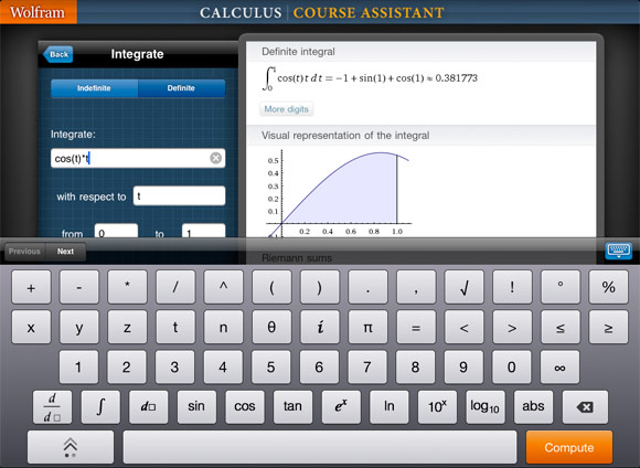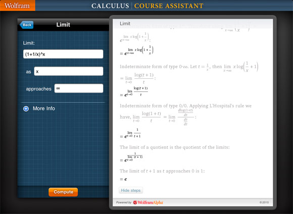 Слыхали, друзья, про Wolfram|Alpha? Если нет, то вы многое потеряли. А если вы ещё и студент, то потеряли вы даже слишком многое. Wolfram|Alpha — это гигантская база знаний. Через неё, в частности, можно решать сложнейшие математические примеры. Надо только знать синтаксис, но вот тут и возникают проблемы. Каким бы простым не был этот самый синтаксис (а в WA он очень простой), по мере усложнения примеров запрос так или иначе становится громоздким. Так вот Calculus Course Assistant представляет из себя визуальный интерфейс математических запросов к Wolfram|Alpha. Это серьёзное ограничение исходного функционала — какой-нибудь курс акций узнать уже не получится. Зато решать примеры — гораздо удобнее.