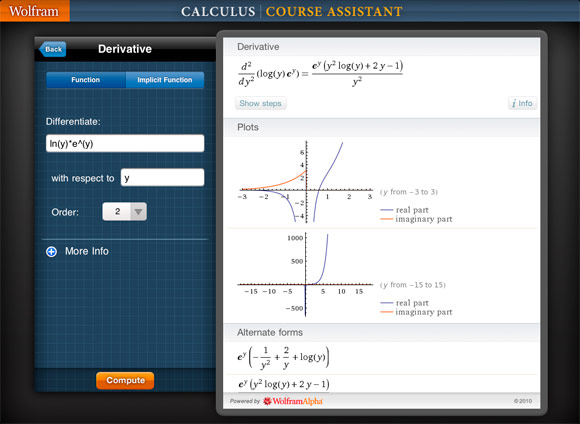Результаты будут представлены так же, как в стандартном Wolfram|Alpha, будь то веб-версия или iOS-приложение: $1.99 [iTunes link]. Иными словами, вы можете вывести полное решение для своего примера, альтернативные формы функций и т.п.