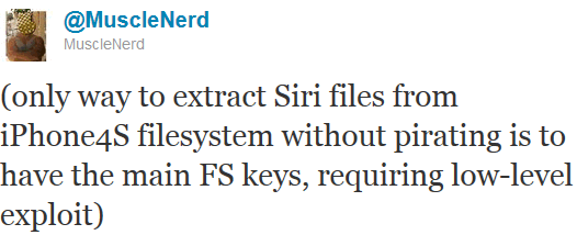 Самый известный и самый «продуктивный» член команды Dev-Team, скрывающийся за ником MuscleNerd, сообщил в своём твиттере, что экстракция кода Siri на другое устройство из-за особенностей системы будет являться актом пиратства. Dev-Team и все известные нам хакеры, причастные к взлому iOS, пиратство категорически не поддерживают и при каждом удобном случае об этом напоминают. При таком раскладе никто из них не будет заниматься портированием Siri. Впрочем, надежда на «мирный» исход ещё остаётся.