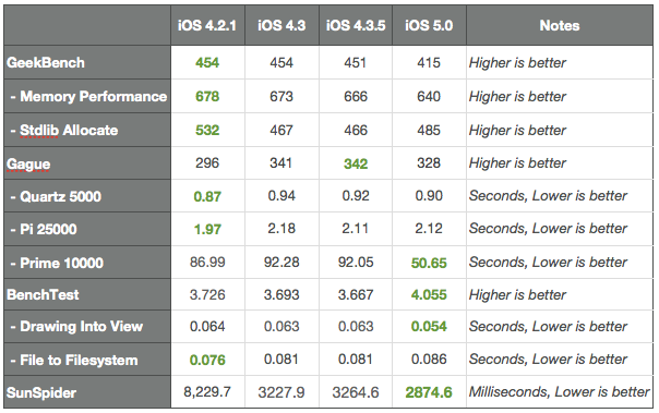 Обновление большинства совместимых устройств с любой прошивки 4.X до iOS 5 приводит к увеличению производительности, которое в некоторых случаях заметно невооружённым глазом. Ускорился даже iPod Touch 4. В этом свете очень странно выглядят прямо противоположные результаты производительности первого iPad (последняя таблица), который явно «ослаб», приняв на себя все нововведения последней прошивки. По непонятной причине энтузиасты не протестировали iPhone 3GS. Если судить по комментариям наших же читателей, прошитый «старичок» стал работать чуть ли не бодрее прежнего. [gigaom]