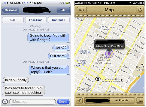 Я купил своей жене новый iPhone 4S и загрузил туда Find My Friends, пока она не видела. Жена сказала мне, что поехала к подруге, живущей в восточной части города. Я подозревал, что она встречается с другим мужчиной, живущим чуть дальше нашего дома. Не поверите, куда указала мне Find My Friends.