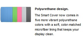 Apple заявляет, что все цвет всех полиуретановых чехлов стал более насыщенным. Кожаные варианты остались неизменными за исключением Smart Cover синего цвета. Его довели до соответствия более глубокому оттенку, похожему на городской камуфляж. Цена на аксессуары осталась прежней — 39 долларов за полиуретановый и 69 долларов за кожаный SC. Если вы всё ещё не обзавелись этим аксессуаром — самое время задуматься о покупке. [store.apple.com]