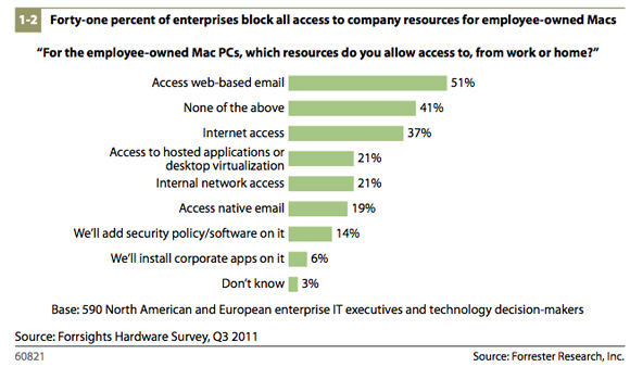 Выше в таблице наглядно показано, что же в корпорациях опрошенных IT-менеджеров разрешается делать Mac-пользователям с помощью их компьютеров. Так, 41% компаний вообще не пускают к корпоративному контенту машины Apple. В 51% фирм разрешено получить доступ к почте через веб-интерфейс, выходить в Интернет дозволено в 37% компаний, доступ ко внутренней сети и функциям виртуализации с помощью Mac одобряет 21% корпораций. В 6% случаев на компьютеры Apple даже устанавливаются корпоративные приложения и это большое достижение, так как фактически компании адаптировали свое ПО под OS X. Windows-варианты не рассматриваются, ибо на любой Mac можно установить операционную систему от Microsoft, превратив его в обычный, хоть и привлекательный внешне корпоративный компьютер.