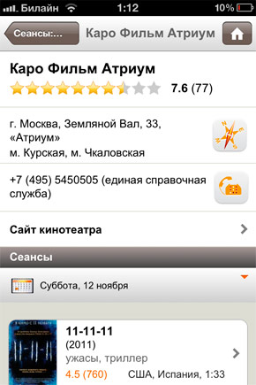 В приложение интегрирована база кинозалов и сеансов. Билет сходу не закажешь, зато можно сразу же узнать адрес (здесь же — карты), позвонить или перейти на сайт кинотеатра. Похвально, что почти во всех разделах предлагаются разные способы сортировки. База большая, но ориентироваться в ней несложно.