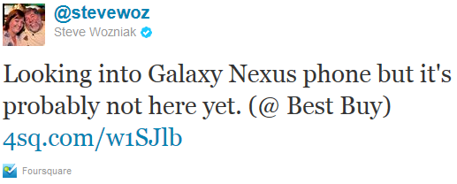 Он искал, где можно купить новый смартфон Galaxy Nexus, представленный несколько недель назад. Твит был отправлен из магазина Best Buy, где, как и ожидалось, этого смартфона ещё не было в продаже. Причина проста: новый флагман серии Nexus ещё не начал продаваться в США. Но Возу улыбнулась удача. Через несколько часов с ним связался представитель Google и предложил забрать свой «нексус» прямо из главного офиса поискового гиганта. Естественно, Стив немедленно воспользовался этим предложением.