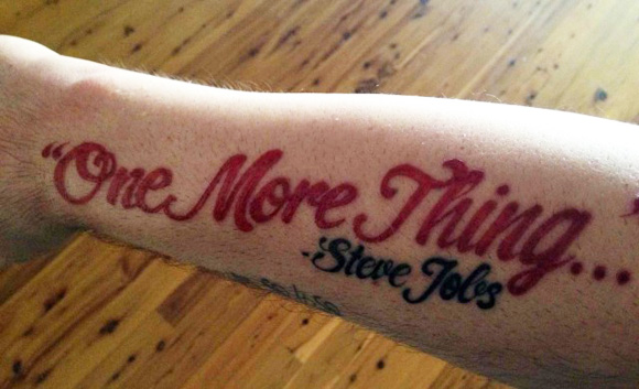 Я выбрал “One more thing”, потому что эта фраза имеет несколько различных значений. Только истинные поклонники Apple будут через некоторое время знать источник этой цитаты. Она знаменует каждый уникальный продукт, доставшийся нам от него. Я живу в Австралии. Эту фразу я делал в местном тату-салоне, в котором набил и все остальные свои татушки. Люди думают, что я сошел с ума, сделав ее, но они пока не достигли в своей жизни того, чего добился Стив. Он для меня стоит на одном уровне с Альбертом Эйнштейном, Альфредом Хичкоком и многими другими великими людьми, сделавшими революцию в нашем сознании.